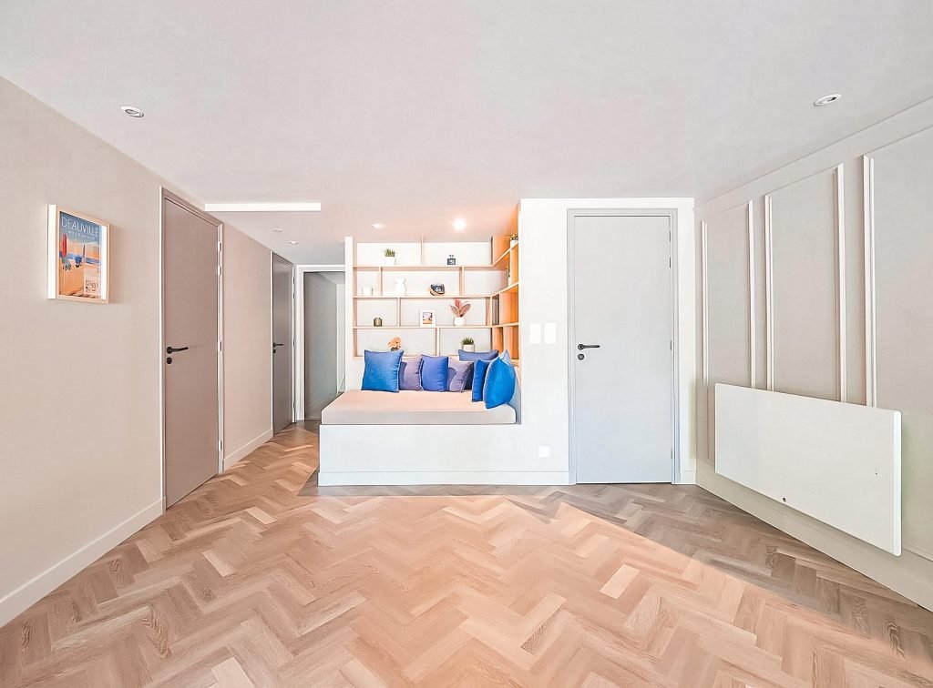 Ancien garage réaménagé en pièce de vie indépendante : chambre d’appoint, bibliothèque sur mesure et coin lecture. Isolation, éclairage et rangements invisibles pour un confort toute l’année.