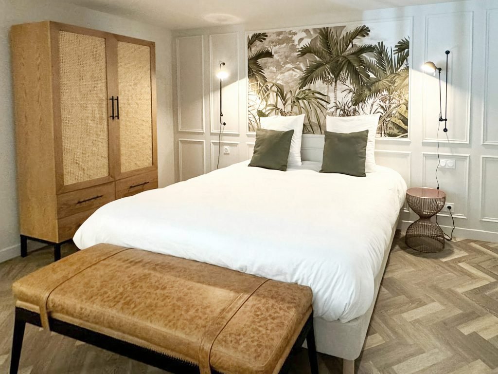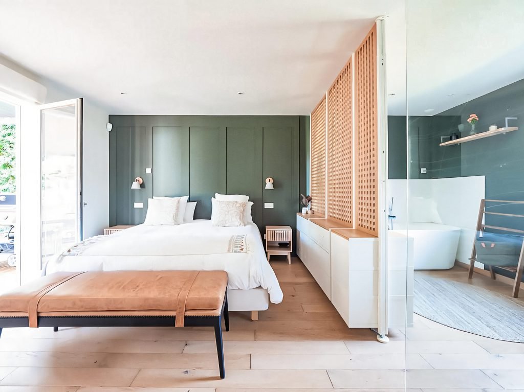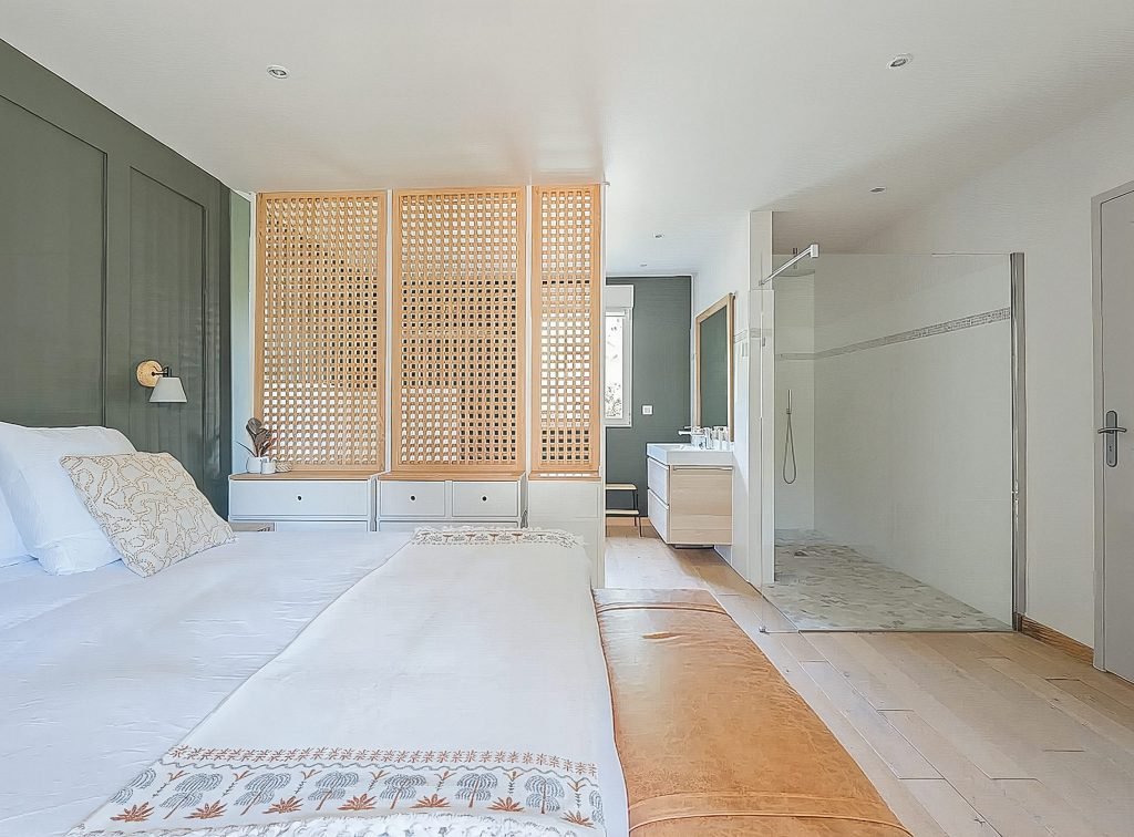 Une cloison claustra (moucharabieh) sépare la chambre et la salle d’eau : intimité, élégance et passage de lumière.