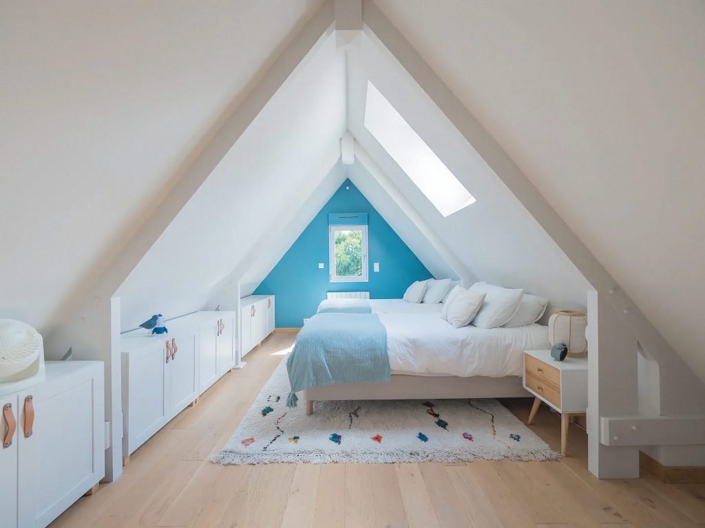 Espace sous combles optimisé : aménagement de combles, rangements sous pente, couleurs calmes et mobilier évolutif. Lumière naturelle (lucarnes/Velux) et circulation fluide pour un confort au quotidien.