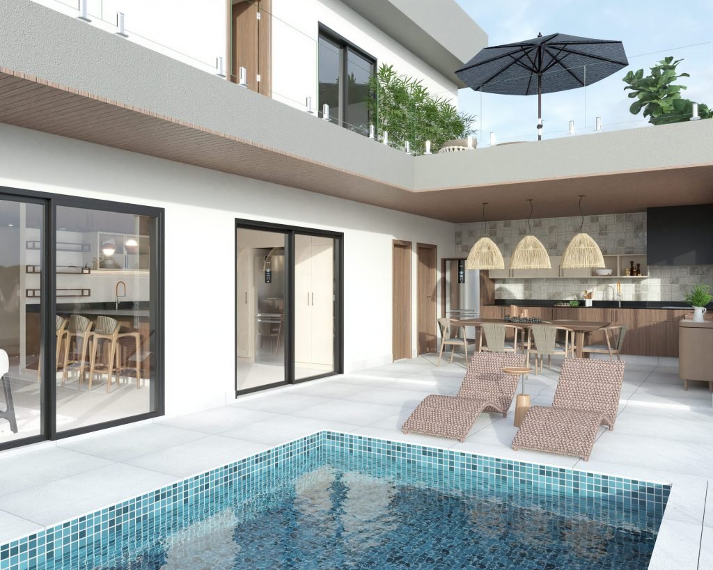À l’extérieur, une cuisine d’été pensée pour partager : plan fonctionnel, matériaux résistants, espace de convivialité.