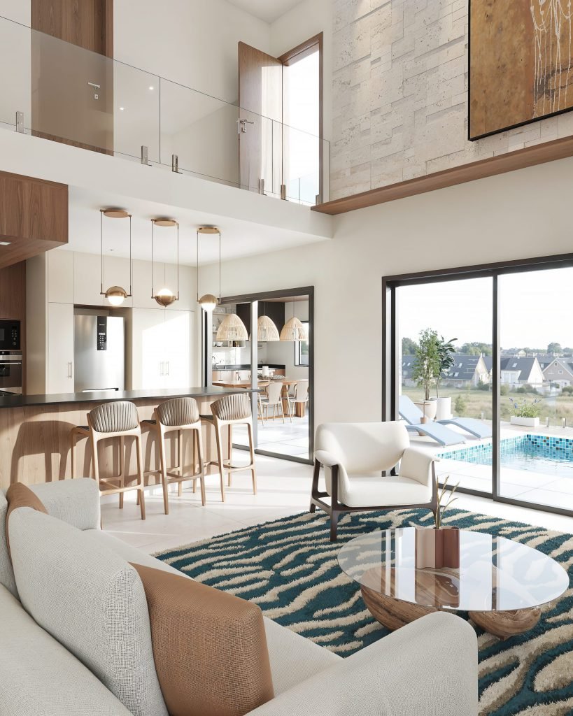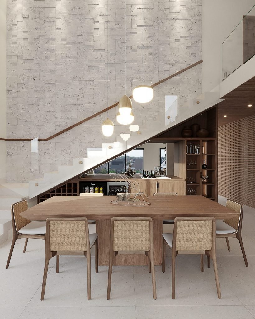 Un meuble bar sur mesure habille la sous-pente et fait vivre un coin oublié : rangements, niches et plateau prêt à recevoir.