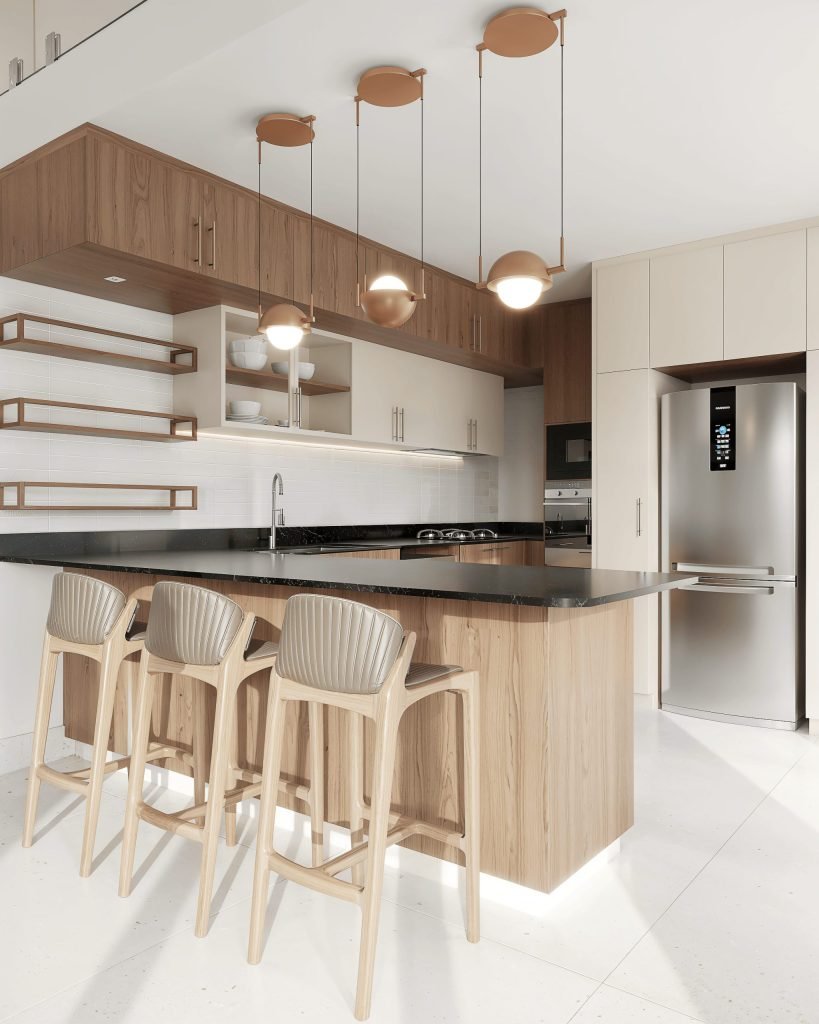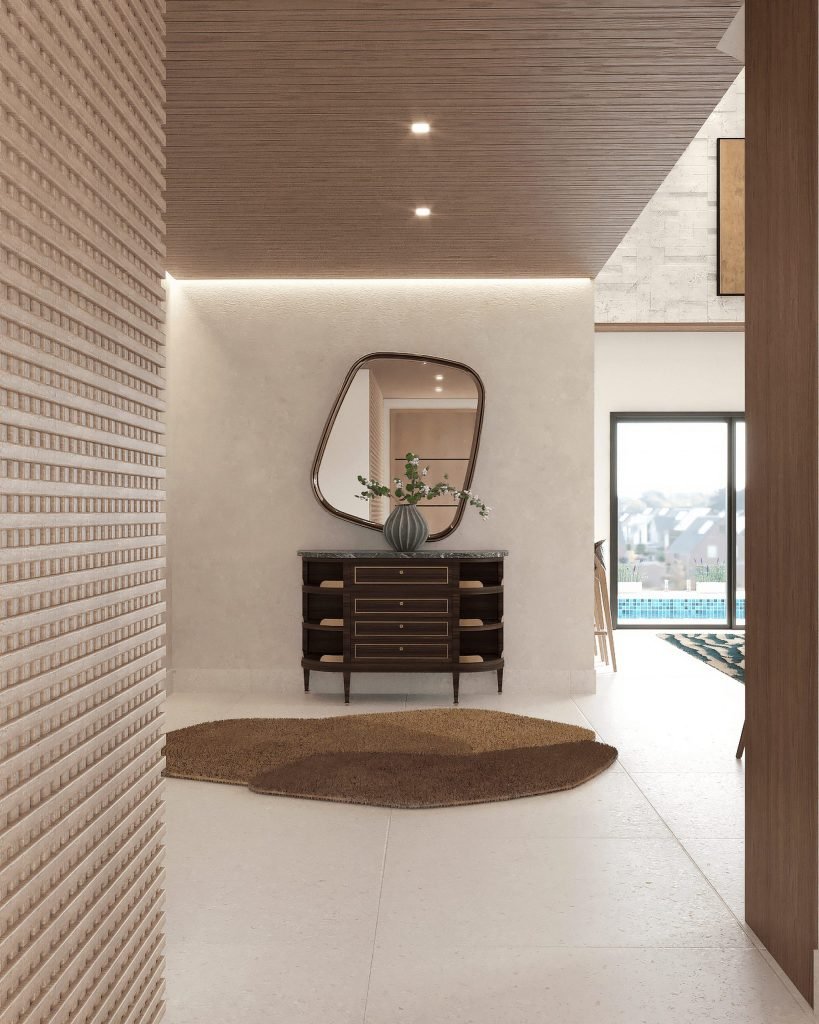 Des meubles et pièces chinées en voyage dialoguent avec un mobilier sur mesure en bois sombre : chaleur et contraste sur fond de marbre blanc.