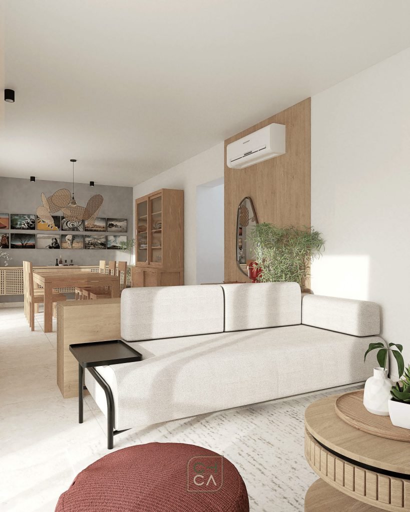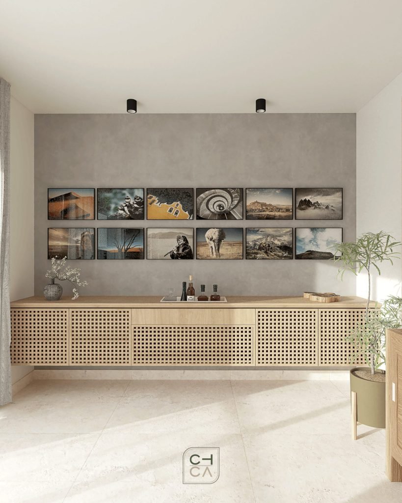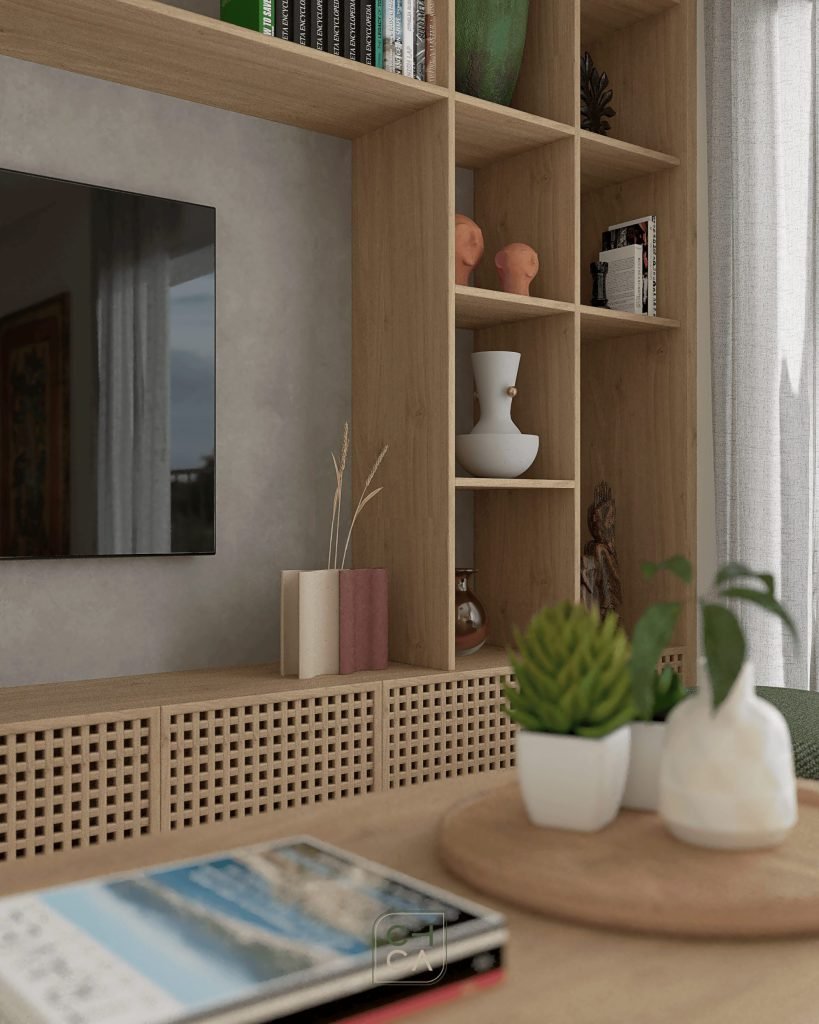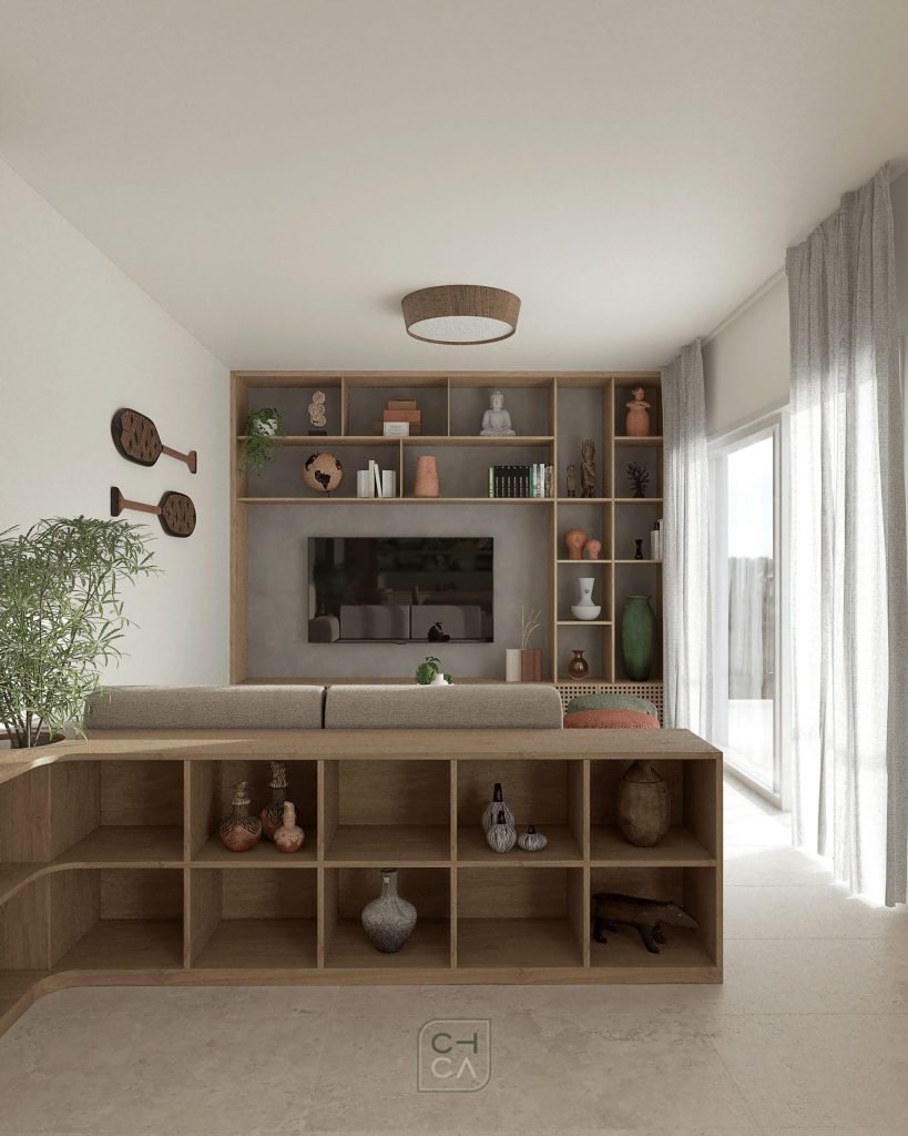 Délimite subtilement le séjour, accueille livres et objets ; détail végétal intégré.