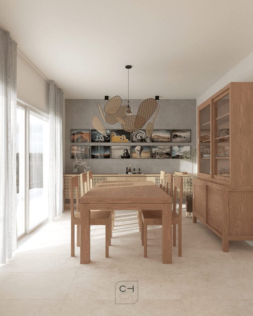 Dans la salle à manger, plateau en pierre servant de mini-bar — pratique et raffiné.